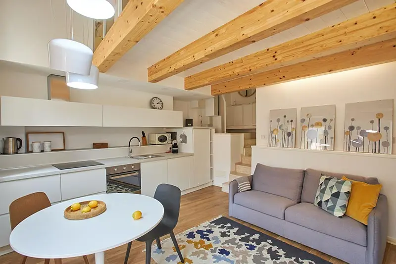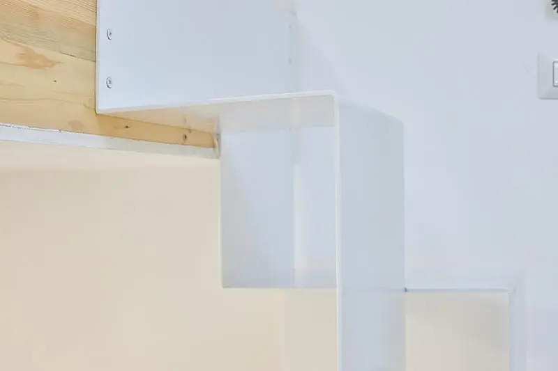 La scelta cromatica è essenziale e luminosa: il bianco dialoga con il legno naturale di rovere, creando un equilibrio sobrio e accogliente che amplifica la luce naturale e dilata visivamente il volume. La scala in ferro, estremamente compatta, con gradini a barca in metallo, diventa un segno leggero e funzionale, quasi un tratto disegnato nello spazio, che conduce con discrezione alla zona notte.
