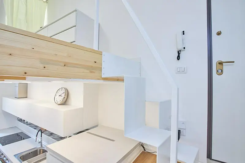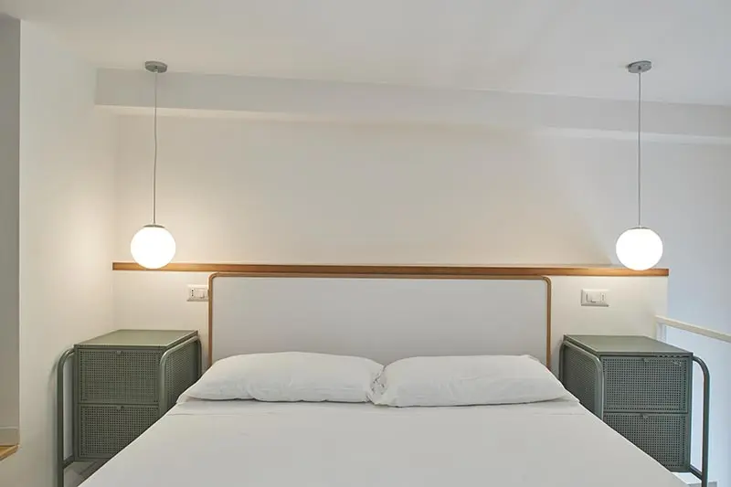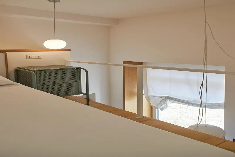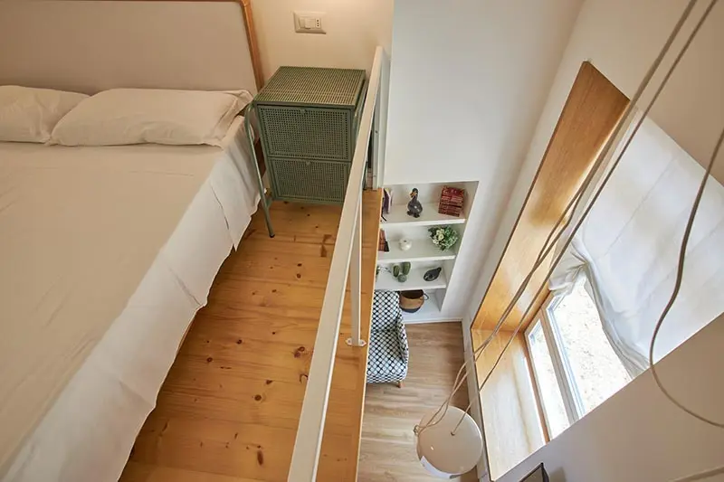 Al livello inferiore si sviluppano la zona giorno e il servizio igienico; sopra, sospesa, la zona notte accoglie il riposo. Il soppalco ospita un ampio letto, una nicchia guardaroba e la zona lavanderia, entrambe celate da tendaggi morbidi e delicati, come quinte leggere che accompagnano i gesti quotidiani. L’altezza interna, portata a 4,60 m, permette allo spazio di respirare, restituendo una percezione ariosa e continua, valorizzata da un’illuminazione a luce calda.