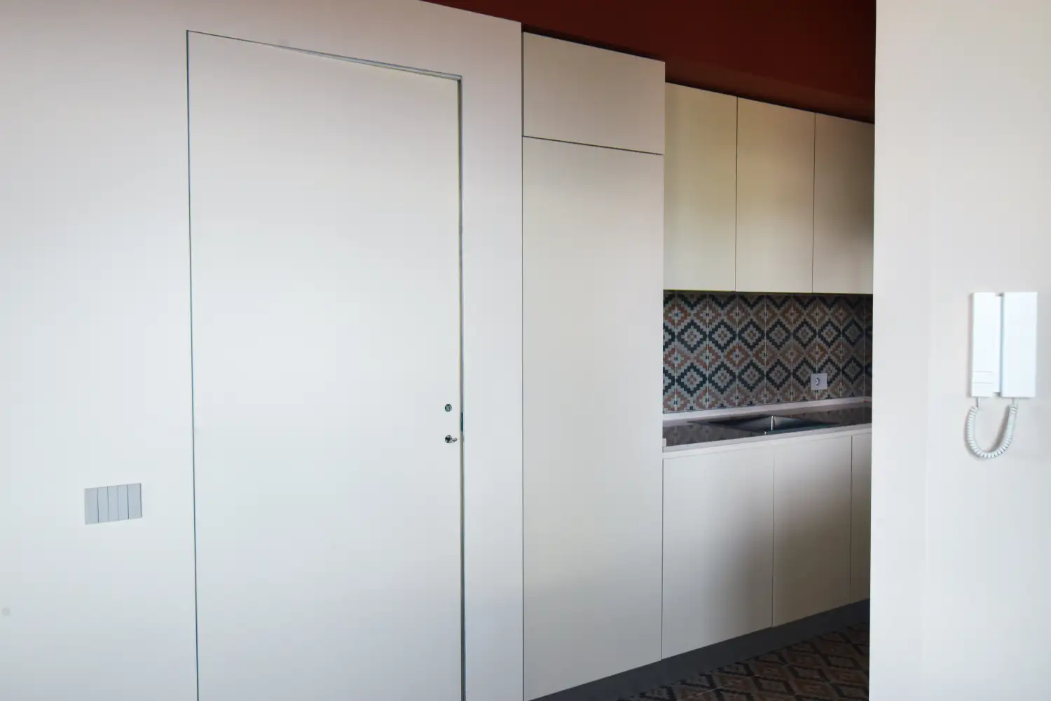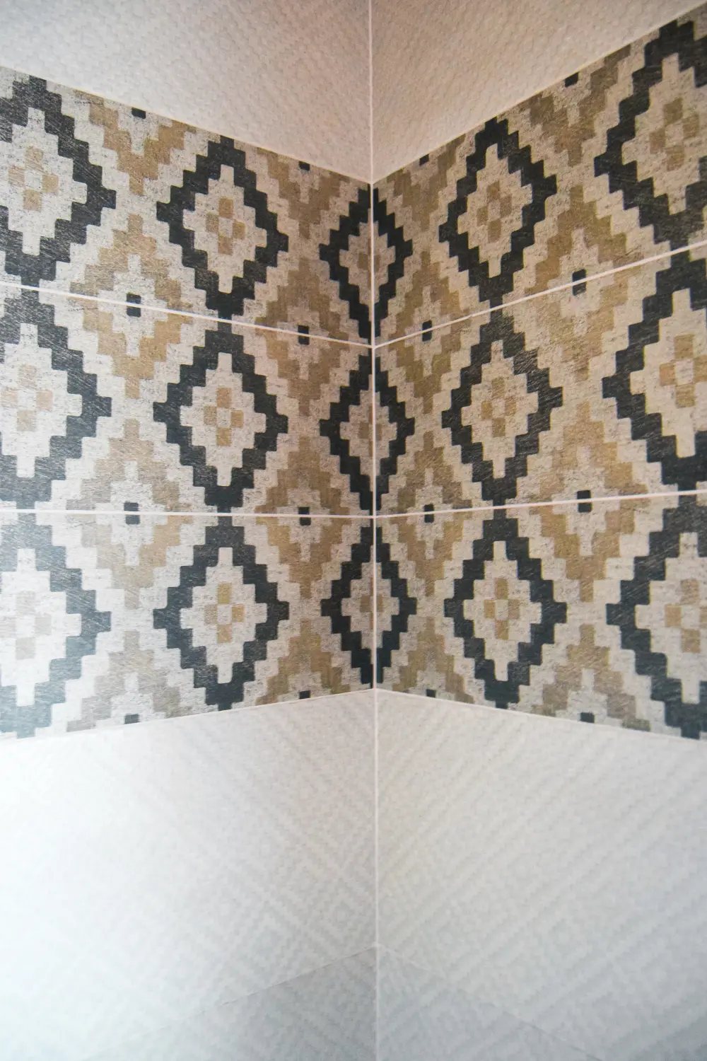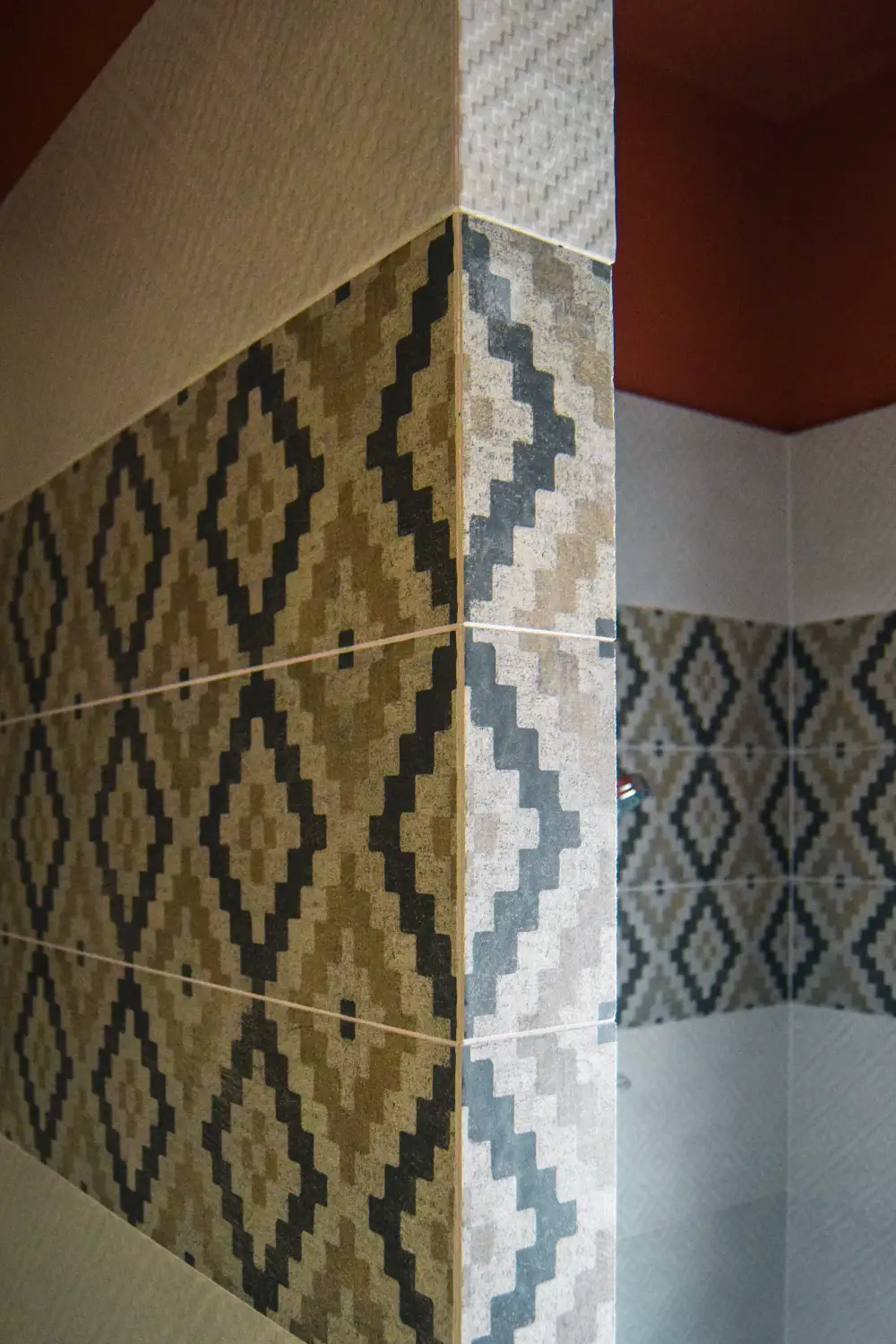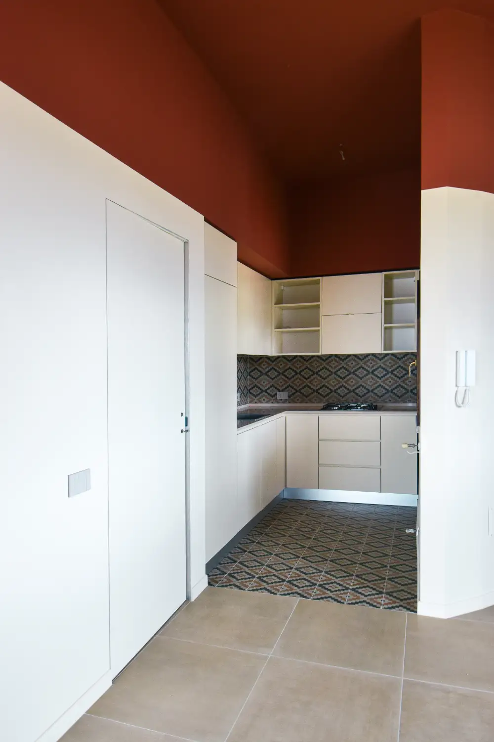 Il progetto di completamento degli interni degli appartamenti nasce dall’intento di creare un dialogo armonico tra tradizione e contemporaneità. Gli interni evocano l’identità dell’isola attraverso un linguaggio moderno che non rinuncia alla memoria dei suoi segni più autentici. Gli spazi si distinguono per l’uso di cromie ispirate alla natura dell’isola: i rossi e i bruni della terra, i beige sabbiosi e i verdi mediterranei che richiamano la vegetazione e la luce calda del paesaggio. Le superfici ceramiche giocano un ruolo centrale: i rivestimenti reinterpretano i motivi geometrici delle tessiture tradizionali sarde, trasformandoli in trame decorative dal carattere contemporaneo. Nei pavimenti e nei rivestimenti a parete, i pattern si alternano a campiture neutre, dando vita a un equilibrio fatto di ritmo e sobrietà. La cucina e gli spazi di servizio sono caratterizzati da linee pulite e volumi essenziali, esaltati da dettagli di forte personalità come le maioliche decorative, che raccontano un legame con il patrimonio artigianale locale.
