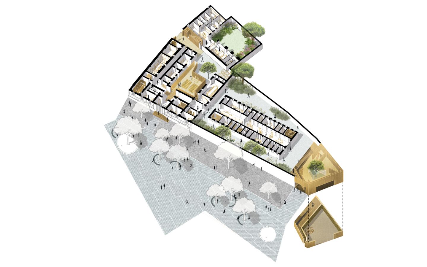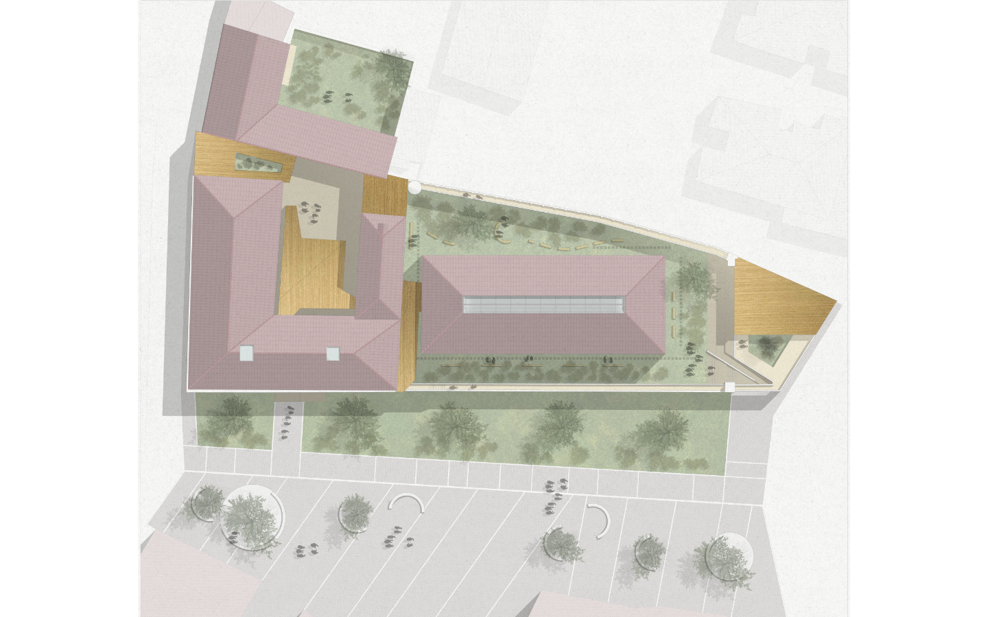 La proposta prevede la trasformazione del complesso in sede della Prefettura, organizzata in poli funzionali distinti ma interconnessi, integrando spazi istituzionali, uffici amministrativi e residenze di rappresentanza. Parallelamente, una parte significativa del piano terra viene destinata a funzioni pubbliche e culturali, tra cui gli “Spazi della Memoria”, concepiti come dispositivo museografico dedicato alla storia del luogo e ai temi della giustizia e della reintegrazione sociale. L’intervento ridefinisce inoltre il sistema degli spazi aperti attraverso la pedonalizzazione dei cortili, la creazione di giardini e la realizzazione di nuove connessioni urbane con piazza Manno e il centro storico.