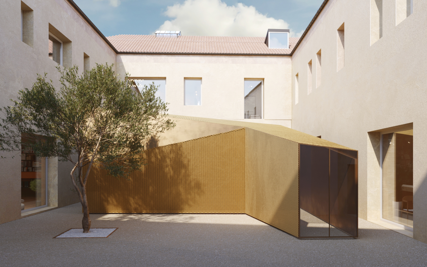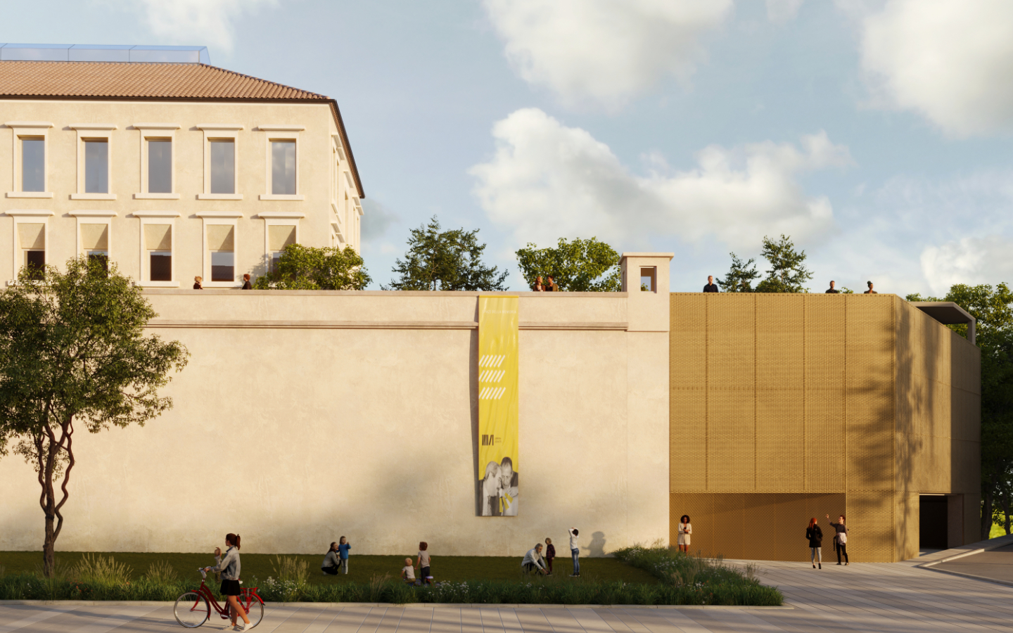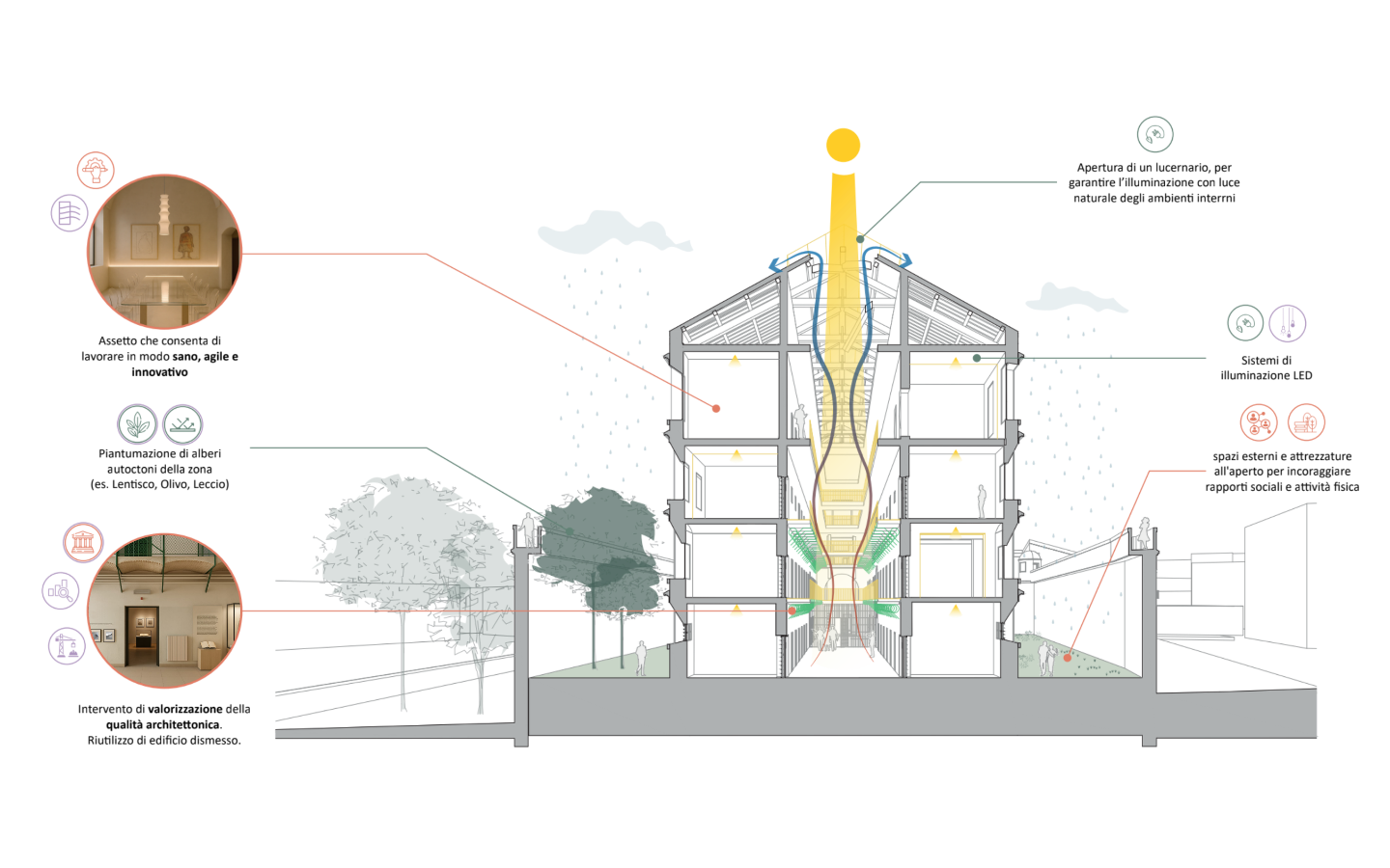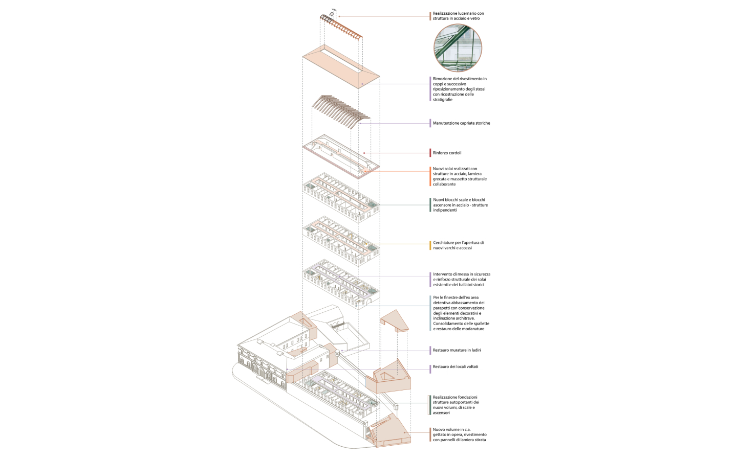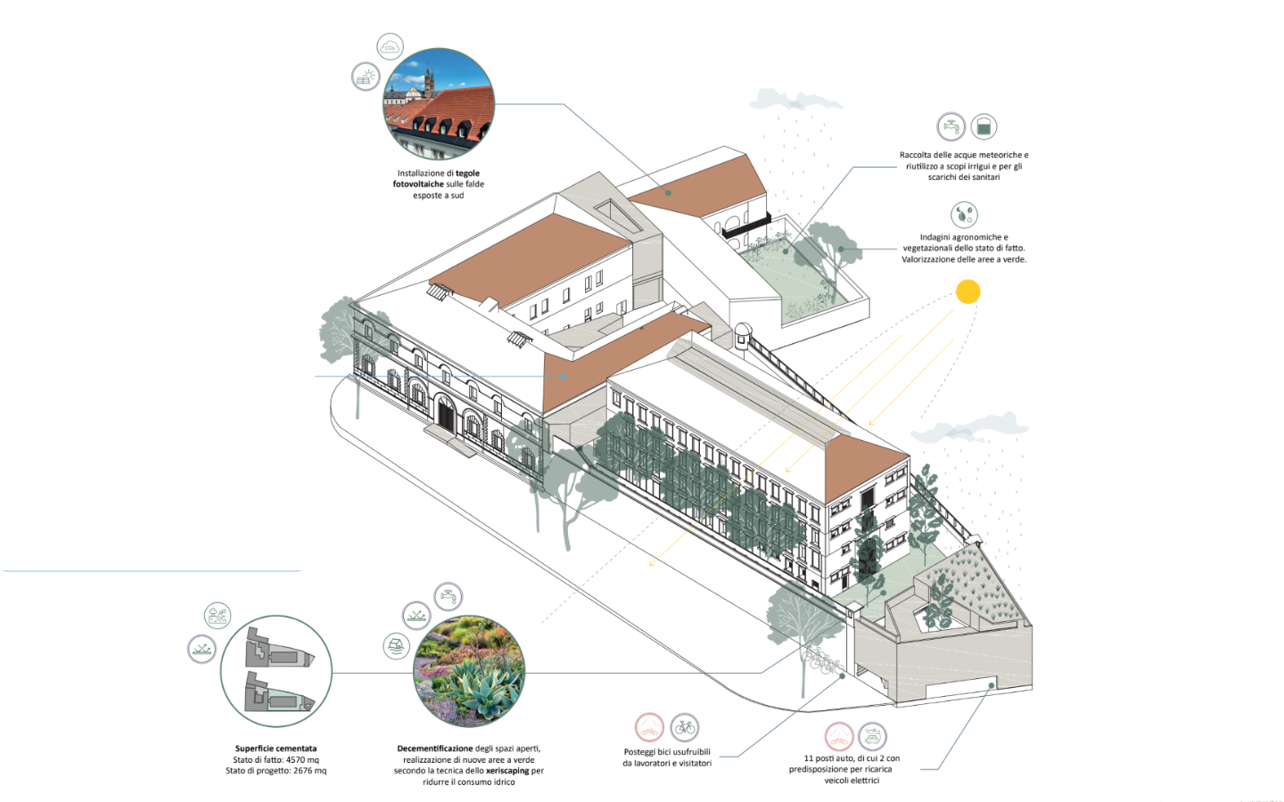 Dal punto di vista tecnico, il progetto adotta soluzioni strutturali leggere e reversibili, prevalentemente in acciaio e legno, e un sistema impiantistico ad alta efficienza basato su pompe di calore geotermiche e integrazione fotovoltaica, con l’obiettivo di raggiungere standard energetici NZEB. L’intervento si configura quindi come un modello di riuso adattivo del patrimonio costruito, capace di trasformare un luogo storicamente chiuso in una nuova polarità urbana inclusiva, culturale e istituzionale.