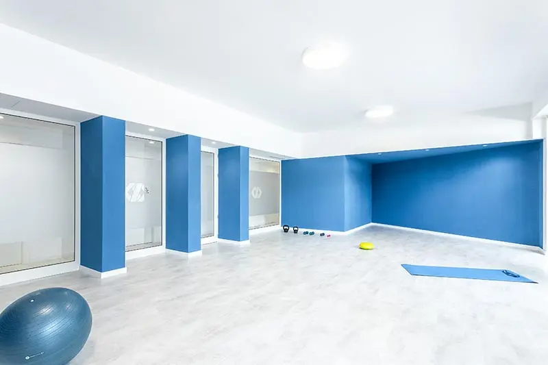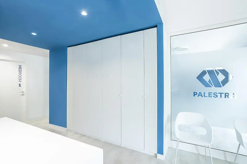 Il locale mantiene i due accessi esistenti e si compone di una sala d’attesa con spazio reception, un disimpegno comune di collegamento ai 4 studi, una palestra, un bagno e uno spogliatoio pazienti/utenti, un bagno spogliatoio per il personale, e due depositi, uno attrezzature e uno sporco – pulito.