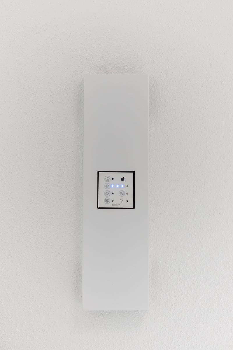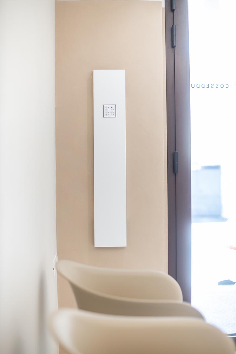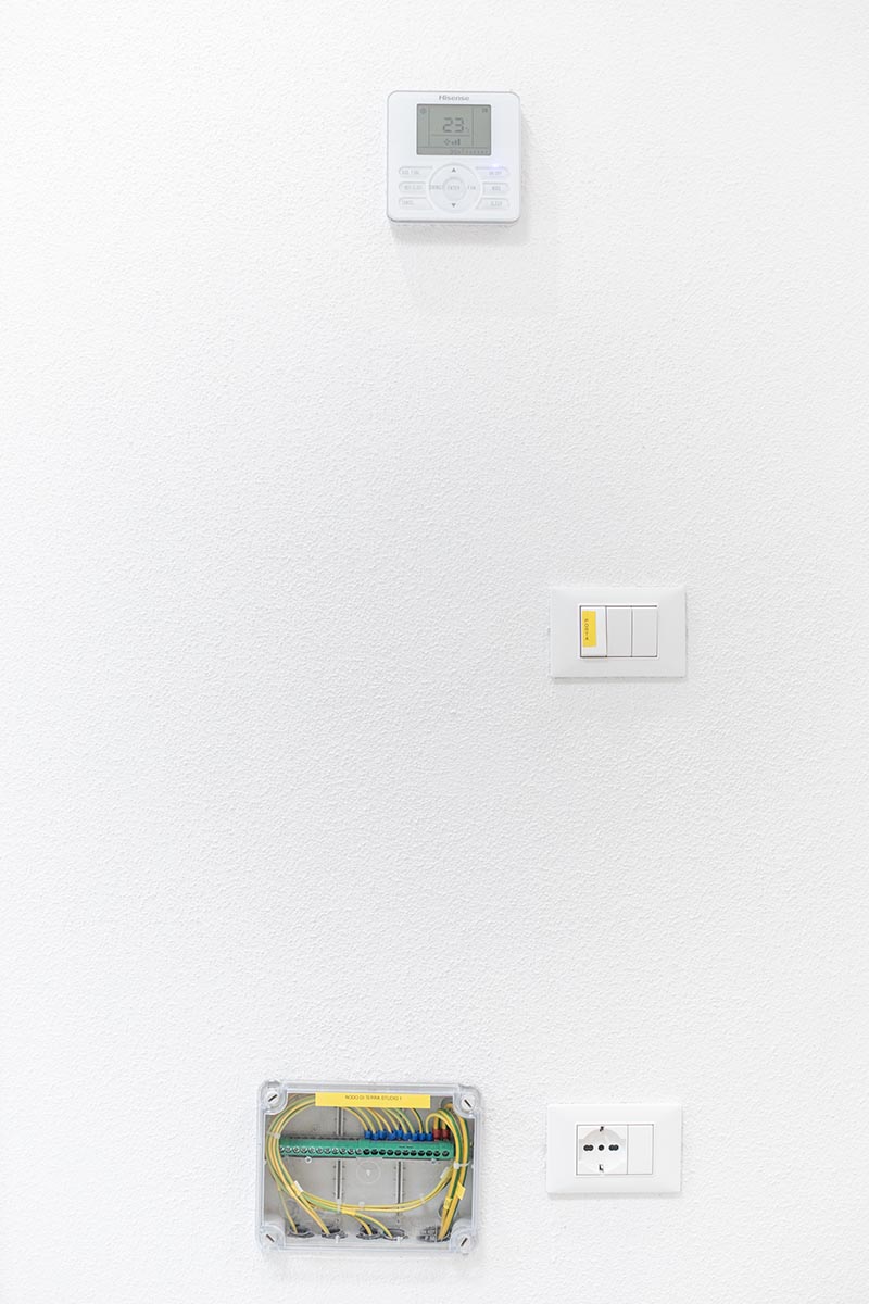 Le dotazioni tecnologiche sono state integrate in modo discreto e non invasivo: un impianto VRV canalizzato assicura il controllo climatico, affiancato da un sistema di ventilazione meccanica controllata con recupero di calore e monitoraggio della CO₂. Completano l’intervento impianti elettrici e domotici conformi alle normative per gli studi medici, con nodi equipotenziali a vista.