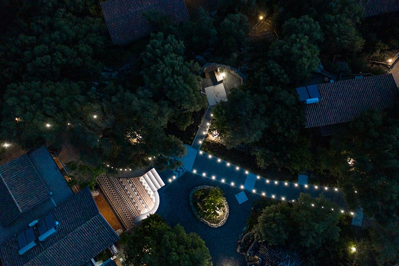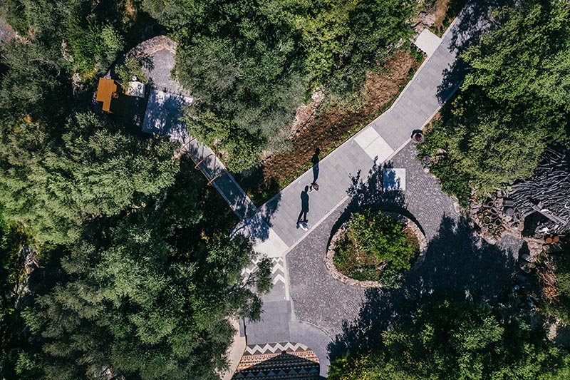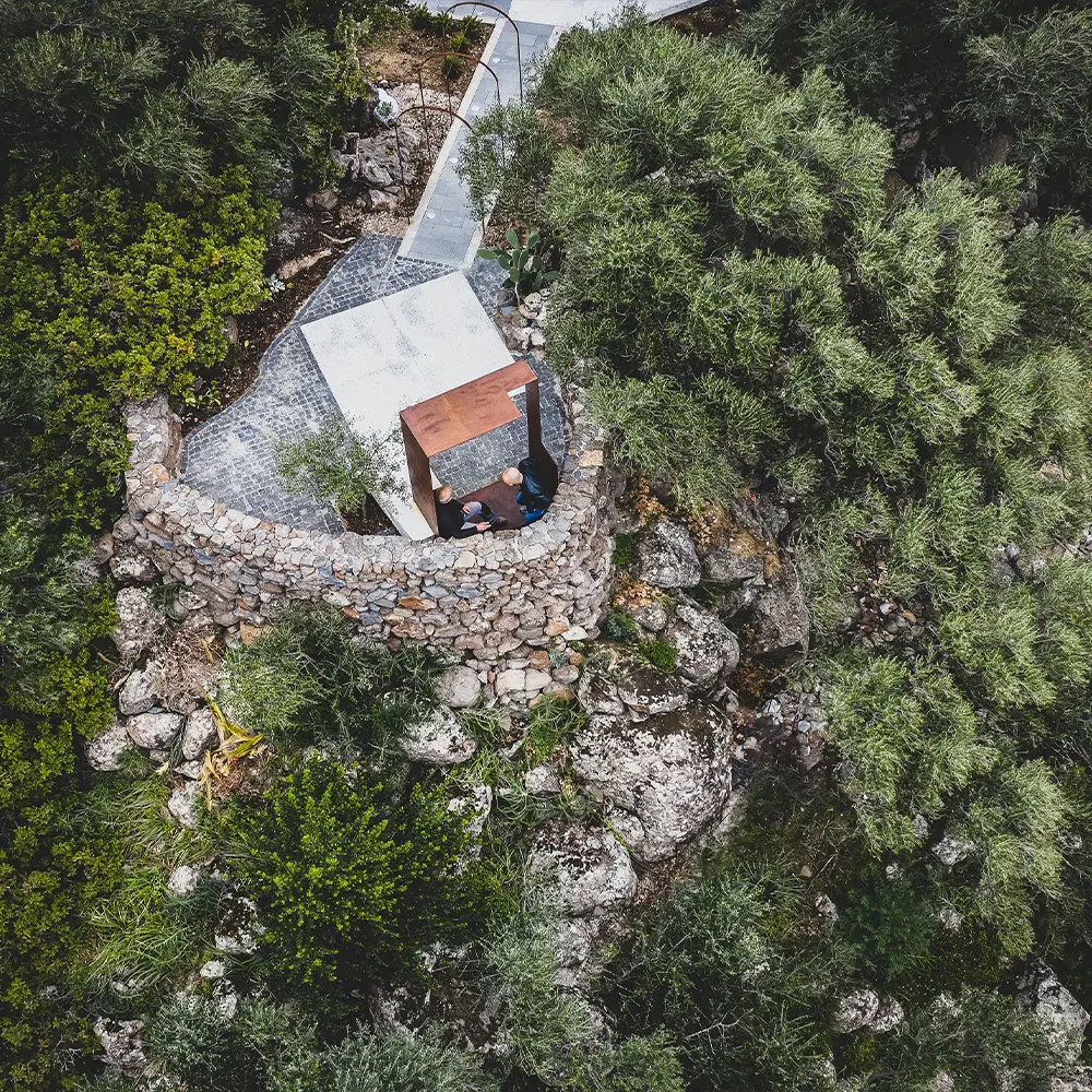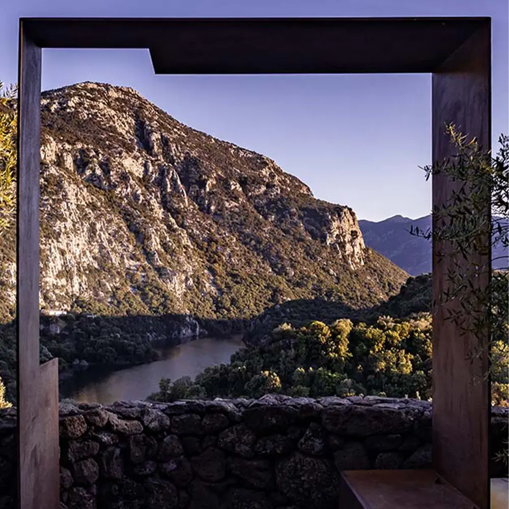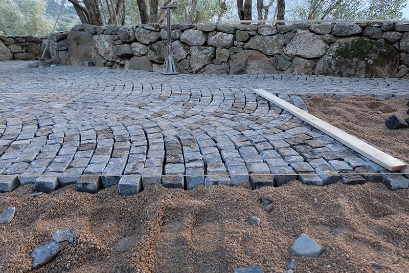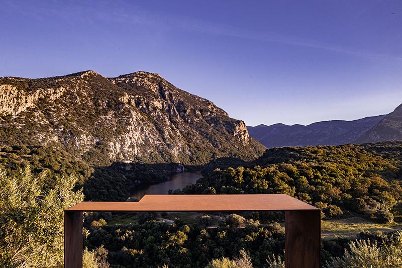 L’intervento consiste nel ripensamento degli spazi esterni dell’Agriturismo Canales, situato ai bordi della scarpata basaltica del Cedrino, a Dorgali (Sardegna, Italia); Le scelte progettuali hanno origine nella consapevolezza di una forte necessità di qualità per il progetto nei contesti rurali dell’isola. Una qualità che si cerca di tradurre in forme costruite, reinterpretando i principi e i caratteri di quell’abitare minimo che ha costruito nel tempo il paesaggio a bassa densità dell’isola. Questi principi-temi trovano la loro costruzione formale nell’individuazione di una strada-mosaico che gerarchizza lo spazio informale tra gli edifici dell’agriturismo e accenna, tramite scarti e piastre, alle soglie che la mettono in relazione con le diverse aree del sito. Una serie di elementi puntuali, come la cornice-belvedere e la pergola, individuano dei nodi salienti del sistema, legati all’apertura visiva verso il panorama del Supramonte. I materiali costitutivi del progetto reinterpretano la complessità morfologica locale, mettendo in campo, letteralmente, elementi in basalto, granito, calcare e laterizio, tessuti secondo trame modulari a formare un ‘tappeto litico’ nella soglia dell’edificio principale. Gli oggetti dello stare invece, la cornice e la pergola, sono realizzati in acciaio patinato, a richiamare l’atemporalità dell’oggetto tecnico che nella ruralità si confronta con l’organicità lapidea della sistemazione della quota zero.