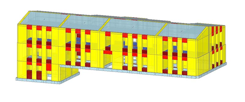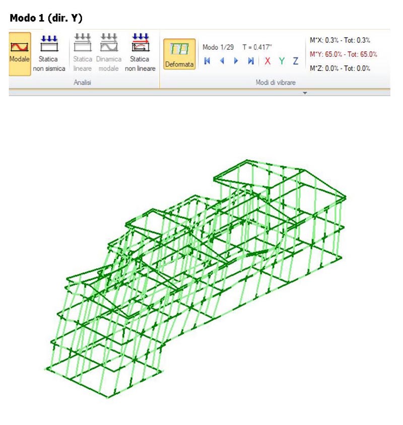 La struttura è suddivisa in elementi beam per la schematizzazione di travi e pilastri, maschi murari, strisce che simulano la presenza di di architravi e/o cordoli e di sottofinestra che ai fini del calcolo sono stati considerati incernierati attorno all’asse y locale. Nell’intersezione tra le aste sono presenti link rigidi.