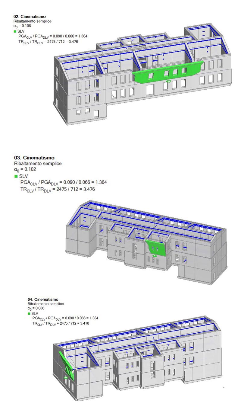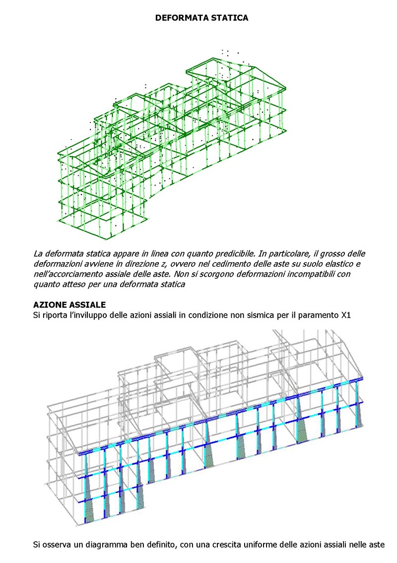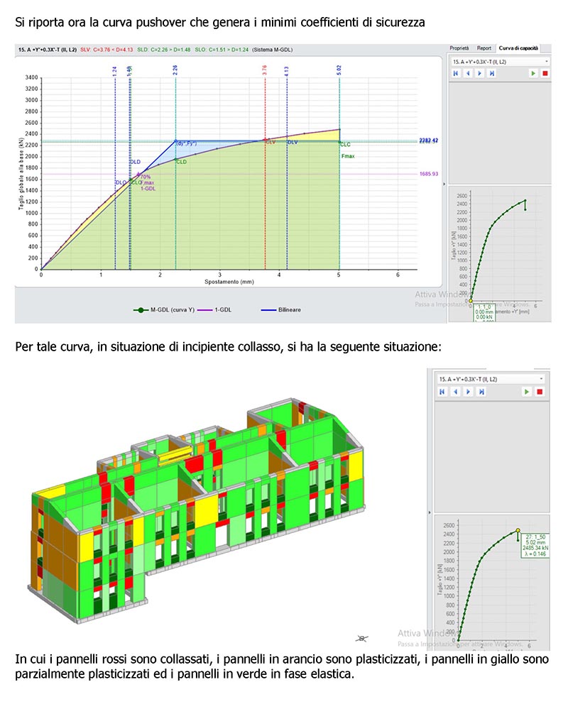 L’edificio è stato verificato mediante analisi pushover con incrementi di taglio pari a 100 kN. La validazione dei risultati è avvenuta mediante lo studio delle deformate modale e delle deformate statiche non sismiche, e la verifica delle azioni assiali in condizioni statiche non sismiche, confrontate con i valori risultanti da un calcolo manuale. Per completare, sono stati verificati i meccanismi locali di collasso